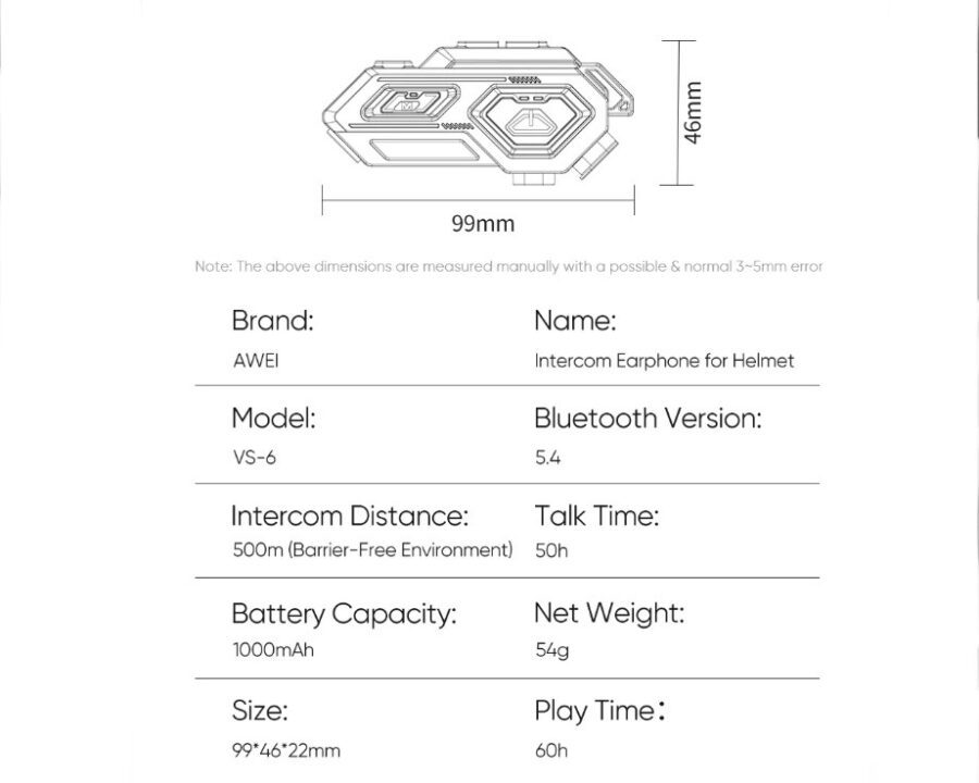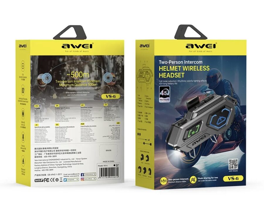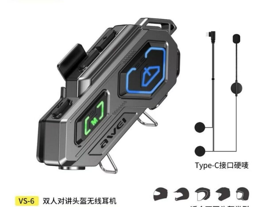 Το Awei VS-6 είναι ένα ακουστικά Bluetooth Intercom σχεδιασμένα για κράνη μοτοσικλέτας, διευκολύνοντας την ασύρματη επικοινωνία μεταξύ δύο αναβατών και επιτρέποντας την κοινή χρήση μουσικής. Δεν είναι ένα παραδοσιακό σετ ακουστικών.