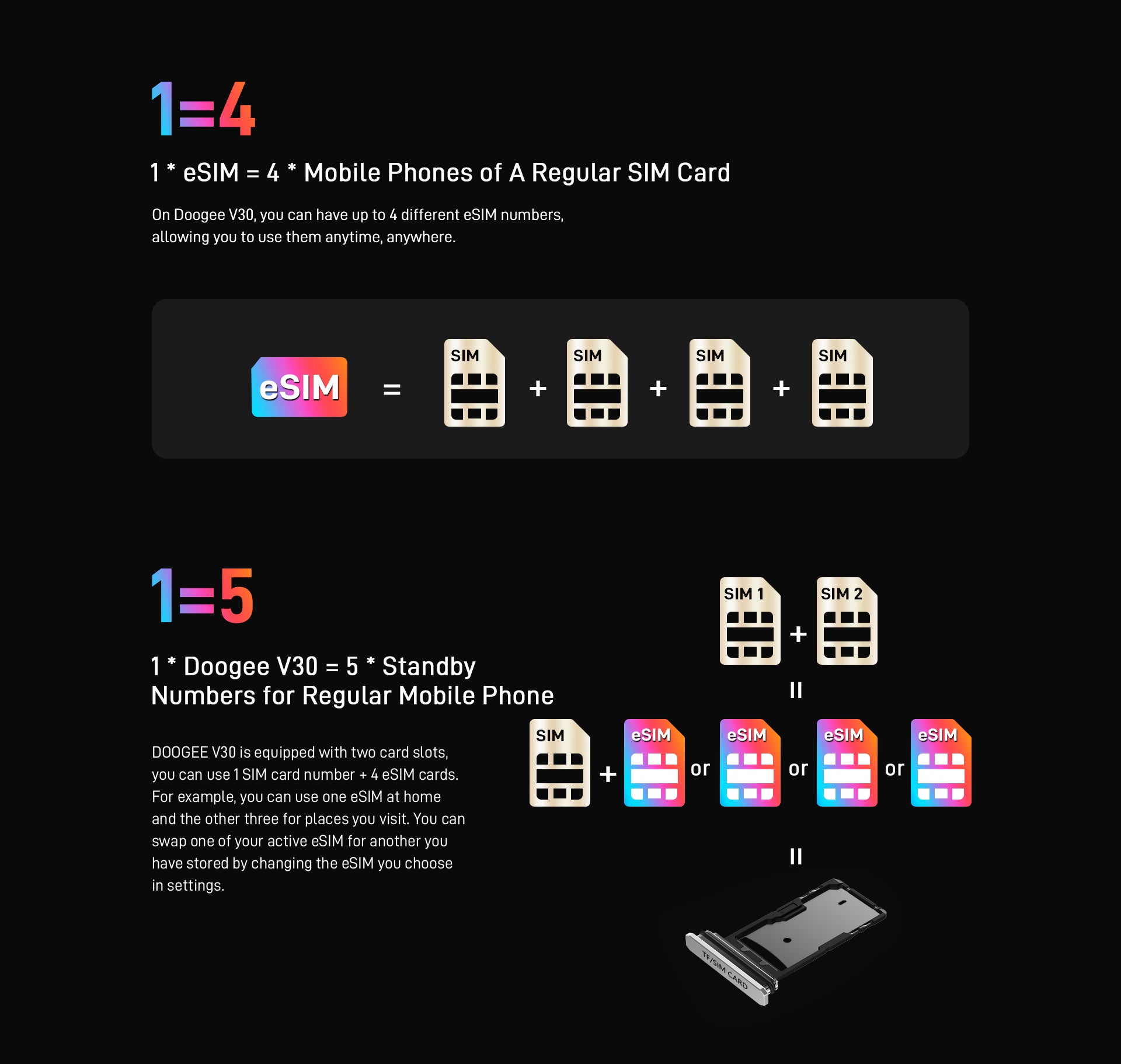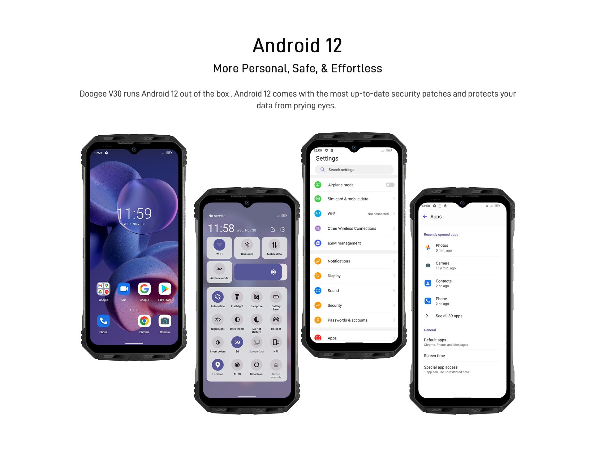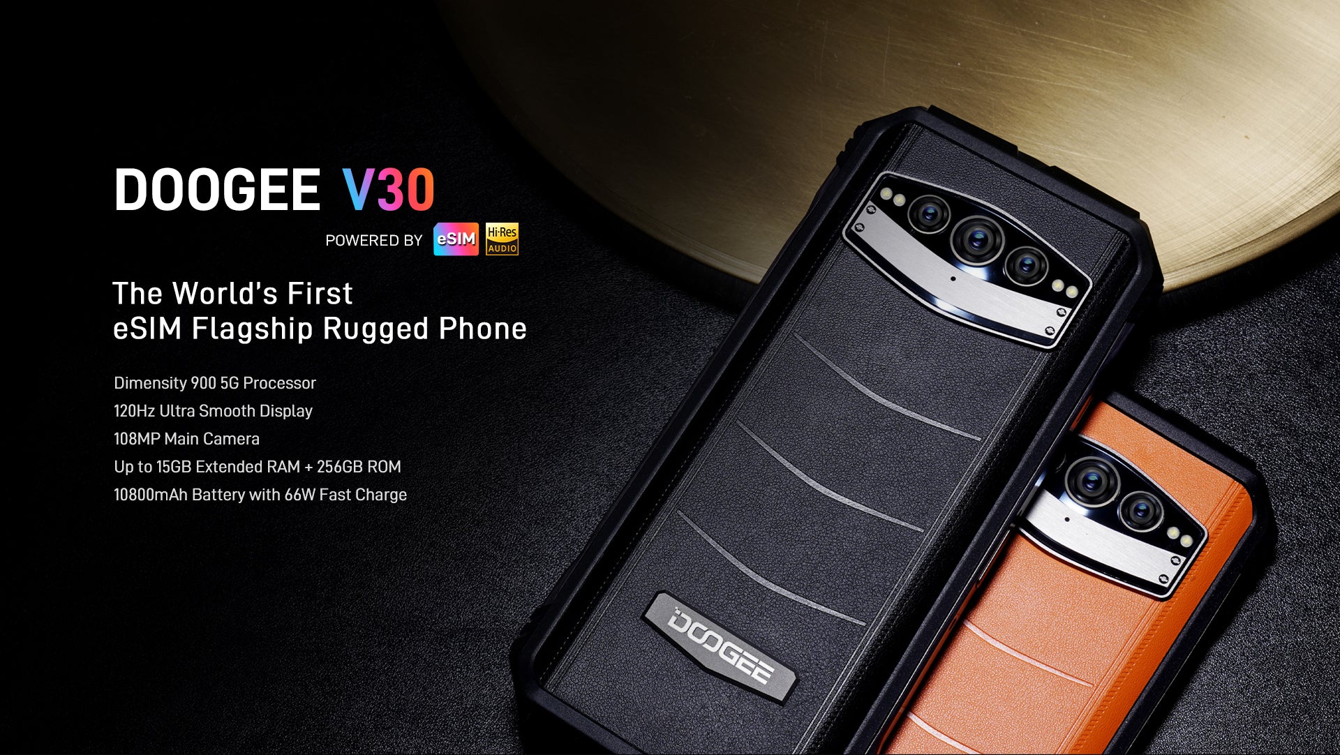Το Doogee V30 είναι ένα από τα πιο κομψά ανθεκτικά smartphones της αγοράς. Αυτό συνδυάζει υλικά υψηλής ποιότητας που το καθιστούν όμορφο και ανθεκτικό ταυτόχρονα, με φινίρισμα σε εφέ δέρματος στο πίσω μέρος, εμπνευσμένο από την ταπετσαρία των αυτοκινήτων υψηλής ποιότητας. Επιπλέον, είναι το πρώτο ανθεκτικό τηλέφωνο που διαθέτει τεχνολογία eSIM , που σας επιτρέπει να συμπεριλάβετε έως και πέντε εικονικές κάρτες SIM συν δύο φυσικές κάρτες SIM και η πιστοποίηση IP68/IP69K/MIL-STD-810G , το V30 είναι μια συσκευή κατασκευασμένη για να αντέχει την έκθεση σε σκληρά περιβάλλοντα χωρίς να θέτει σε κίνδυνο την απόδοσή του. Η τεράστια μπαταρία του 10800 mAh εγγυάται ώρες αδιάκοπης χρήσης και υποστηρίζει γρήγορη 66 W (να γεμίσει την μπαταρία στο 55% σε μόλις 30 λεπτά).