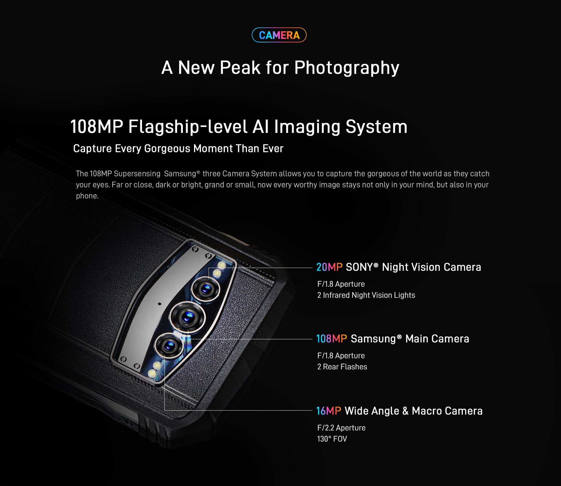 Το Doogee V30 διαθέτει τριπλή πίσω κάμερα Κύρια κάμερα 108 MP (αισθητήρας Samsung S5KHM2SP03, f/1,8) + Κάμερα νυχτερινής όρασης 20 MP (αισθητήρας SONY IMX350, f/1,8) + Κάμερα εξαιρετικά ευρυγώνιας και macro 16 MP (f/2,2, FOV 130º), με Dual Led Flash και σας επιτρέπει να τραβάτε 4K Video , σας επιτρέπει να τραβάτε υπέροχες φωτογραφίες με εξαιρετική ευκρίνεια ακόμα και στο σκοτάδι. Η μπροστινή διαθέτει αισθητήρα 32 MP SONY IMX616-AAJH5-C που σας επιτρέπει να τραβάτε λεπτομερείς φωτογραφίες και να ξεκλειδώνετε το τηλέφωνο με το πρόσωπό σας.