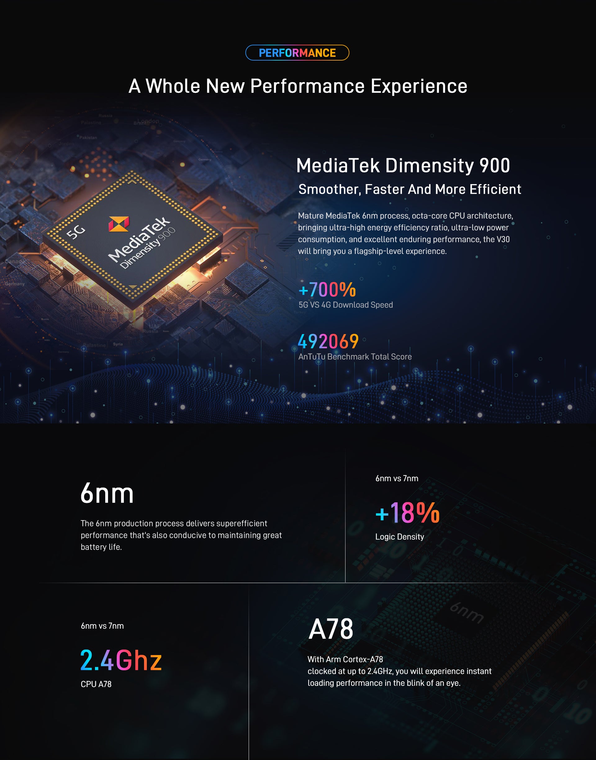 Το Doogee V30 διαθέτει 5G MediaTek Dimensity 900 (MT6877) , ένα chipset οκτώ πυρήνων (2x 2,4 GHz ARM Cortex-A78, 6x 2,0 GHz ARM Cortex-A55) και διαθέτει GPU ARM Mali-G68 MC4, Πυρήνες: 4. Όσο για τις μνήμες, έχει μνήμη RAM 8 GB , επεκτάσιμη κατά 7 GB περισσότερο εικονικά. και εσωτερική μνήμη 256 GB UFS 3.1 , η οποία μπορεί να επεκταθεί έως και 2 TB με κάρτα SD.