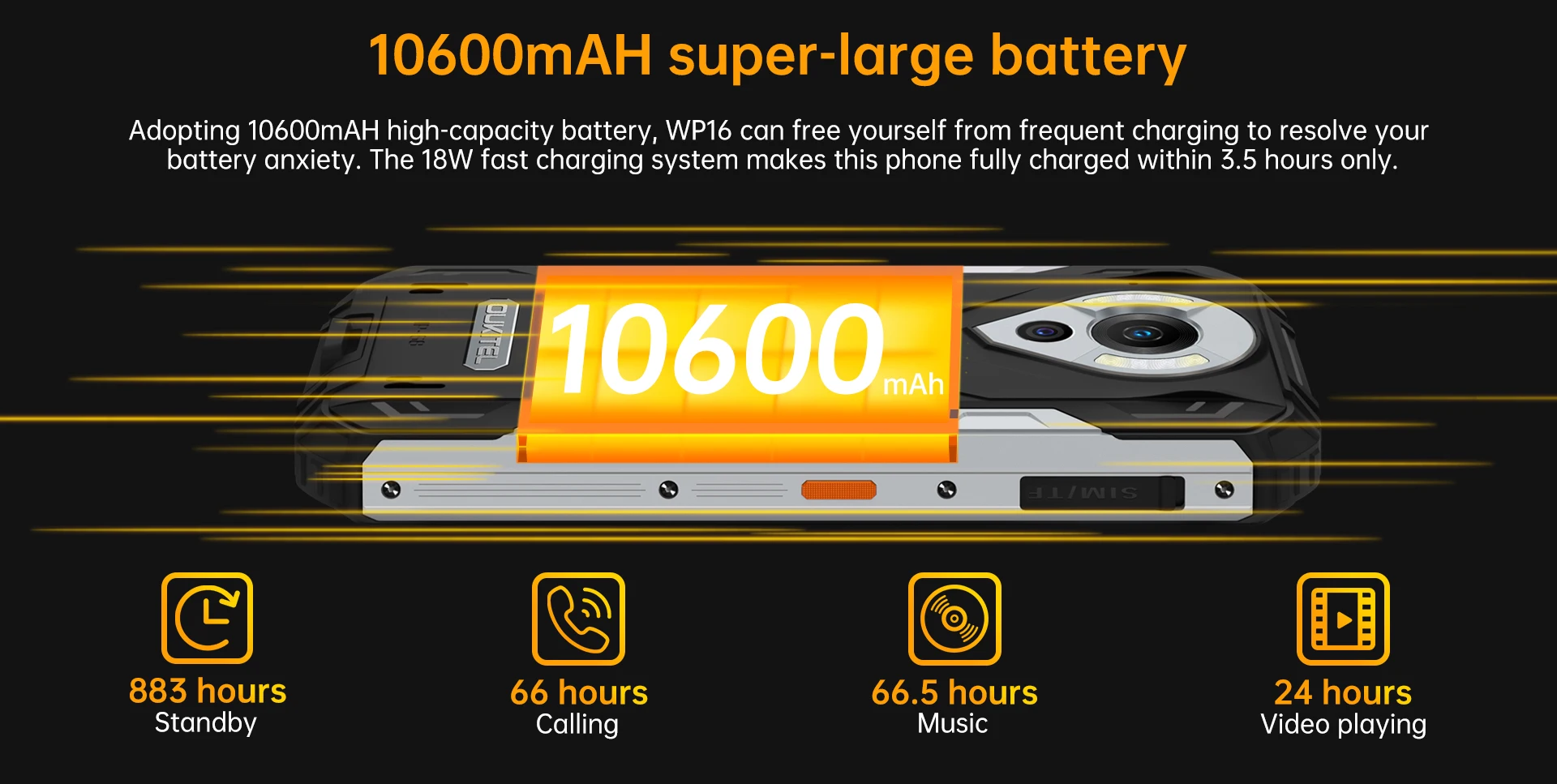 Το Oukitel WP16 είναι ένα Rugged Smartphone που έχει σχεδιαστεί για χρήση σε περίπλοκες καταστάσεις, καθώς επάξια τις IP68,IP69K και MIL-STD-810G πιστοποιήσεις ανθεκτικότητας που του επιτρέπει να αντέχει σε υγρασία, σκόνη αλλά και πτώσεις. έχει μια τεράστια μπαταρία 10600 mAh , διαθέτει γρήγορη φόρτιση 18W.