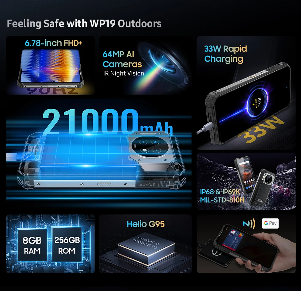 Το Oukitel WP19 είναι ένα smartphone με τεράστια μπαταρία 21000 mAh , δίνοντάς του χρόνο χρήσης έως και 36 ώρες παρακολουθώντας βίντεο. 123 ώρες μουσικής. 122 ώρες κλήσεων και έως 225 ώρες αναμονής. Όλα αυτά με γρήγορη φόρτιση 33W που θα φορτίσει το 80% της μπαταρίας σε λιγότερο από 3 ώρες. Μπορείτε ακόμη και να φορτίσετε άλλες συσκευές, και πιστοποιητικά αντίστασης , όπως IP68*, IP69K και MIL-STD-810H.