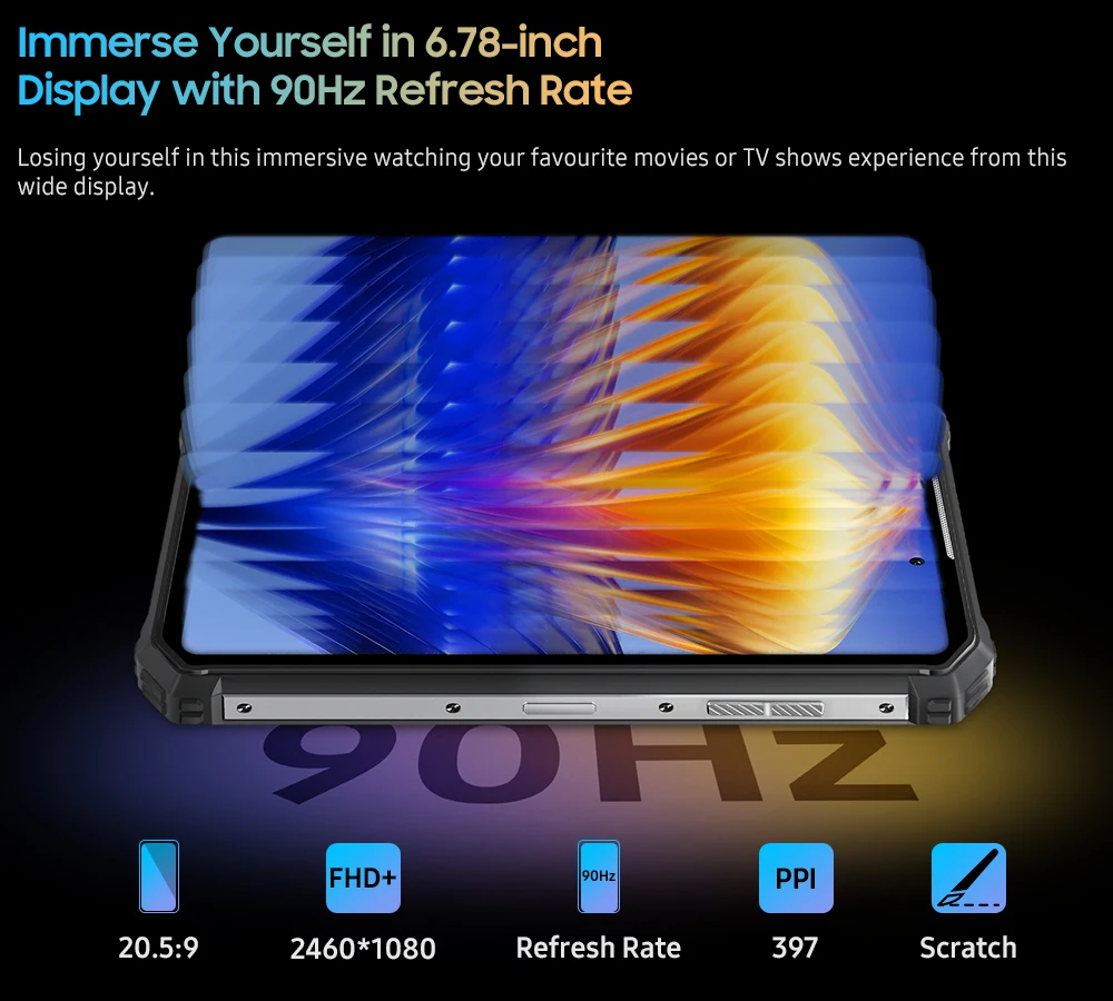 Το Oukitel WP19 διαθέτει οθόνη IPS 6,78 ιντσών με ανάλυση FHD+ ( 1080 x 2460 pixel) και Πυκνότητα 397 ppi και Αναλογία διαστάσεων 20,5:9 και ρυθμό ανανέωσης 90 Hz . Λεπτομερείς, ρευστές εικόνες στην παλάμη του χεριού σας. προστατευμένη με Corning Gorilla Glass, εγγυάται ζωντανά και ρεαλιστικά χρώματα , υψηλή αντίθεση και ευρεία γωνία θέασης, καθώς και εξαιρετική ρευστότητα κατά τη χρήση της