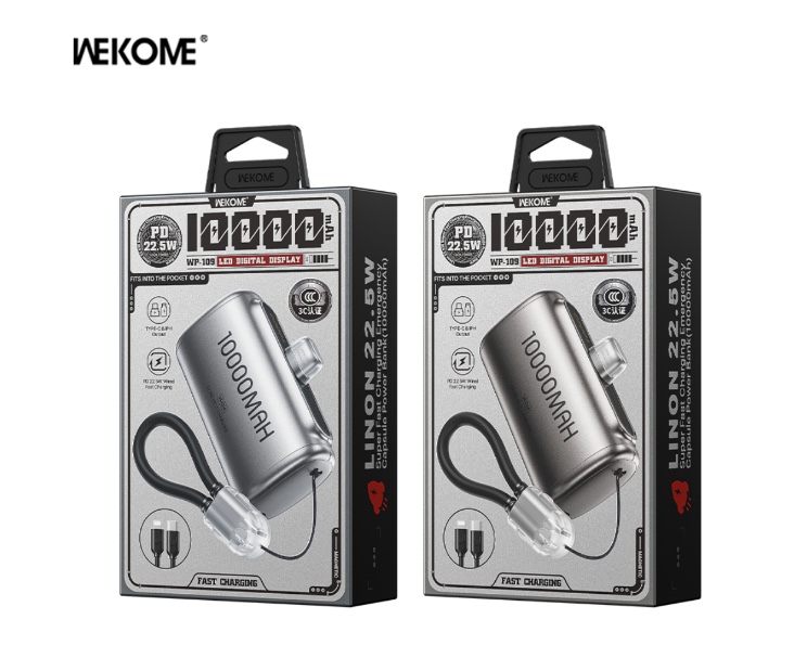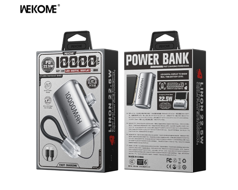 WEKOME WP-109 Κάψουλα έκτακτης ανάγκης 22,5W με εξαιρετικά γρήγορη φόρτιση 10000mAh με πυρίμαχο υλικό, ψηφιακή οθόνη και βύσμα/θύρα USB-C.