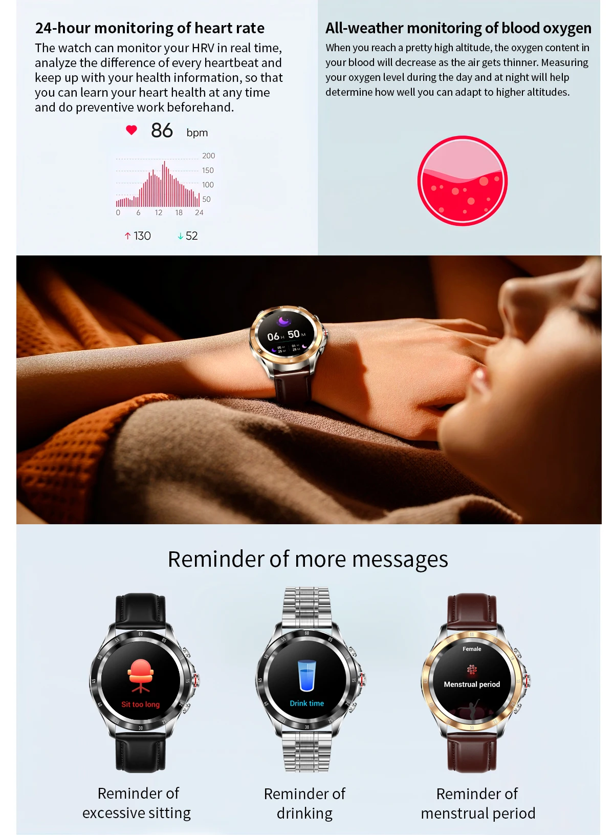 | Other Functions | Time Sync,Timer,Alarm,Gesture wakeup,Find phone,Coming call/SMS reminder,Female menstrual cycle,Remote photograph,Remote music control,Watch faces,Push watch face,DIY watch face,Remote upgrade,Data sync |