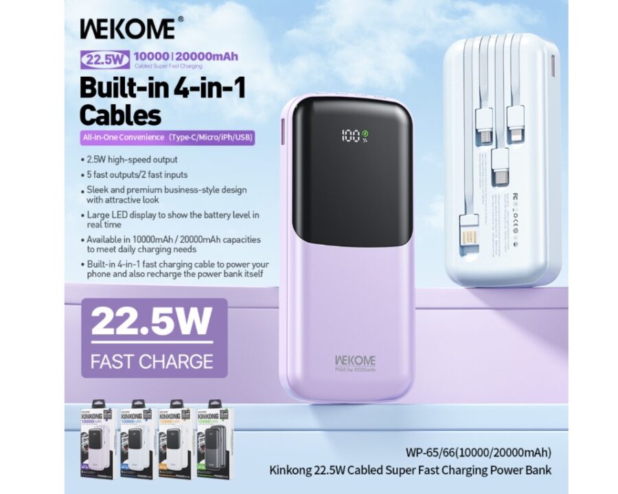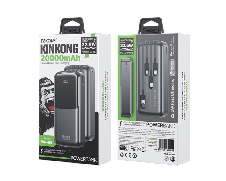 WEKOME WP-66 20000mAh PowerBank με 22,5W εξαιρετικά γρήγορης φόρτισης και 5 γρήγορες εξόδους/2 γρήγορες εισόδους και ενσωματωμένη γρήγορη φόρτιση 4 σε 1.